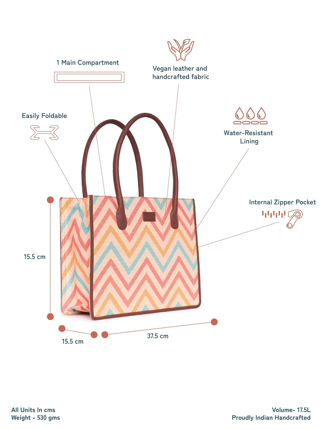 This is a Proudly Indian and 100% PeTA approved book tote,a versatile and functional accessory designed to effortlessly blend fashion and practicality. This unique handbag takes inspiration from the classic book tote design while adding modern elements that make it a true standout.It features a spacious main compartment, providing ample room for your belongings, whether it’s your favorite book, a tablet, or everyday essentials like your wallet, keys, and phone. It includes a lining zipper to secure and organize your items. Keep your valuables safe and within reach in the interior zipper pocket.One of the standout features of the Zouk Book Tote Handbag is its foldable gusset. This innovative design element allows you to conveniently fold and store the gusset when the bag is not in use. This is a timeless accessory that can effortlessly elevate any outfit, whether you’re going for a casual day out or attending a more formal occasion.