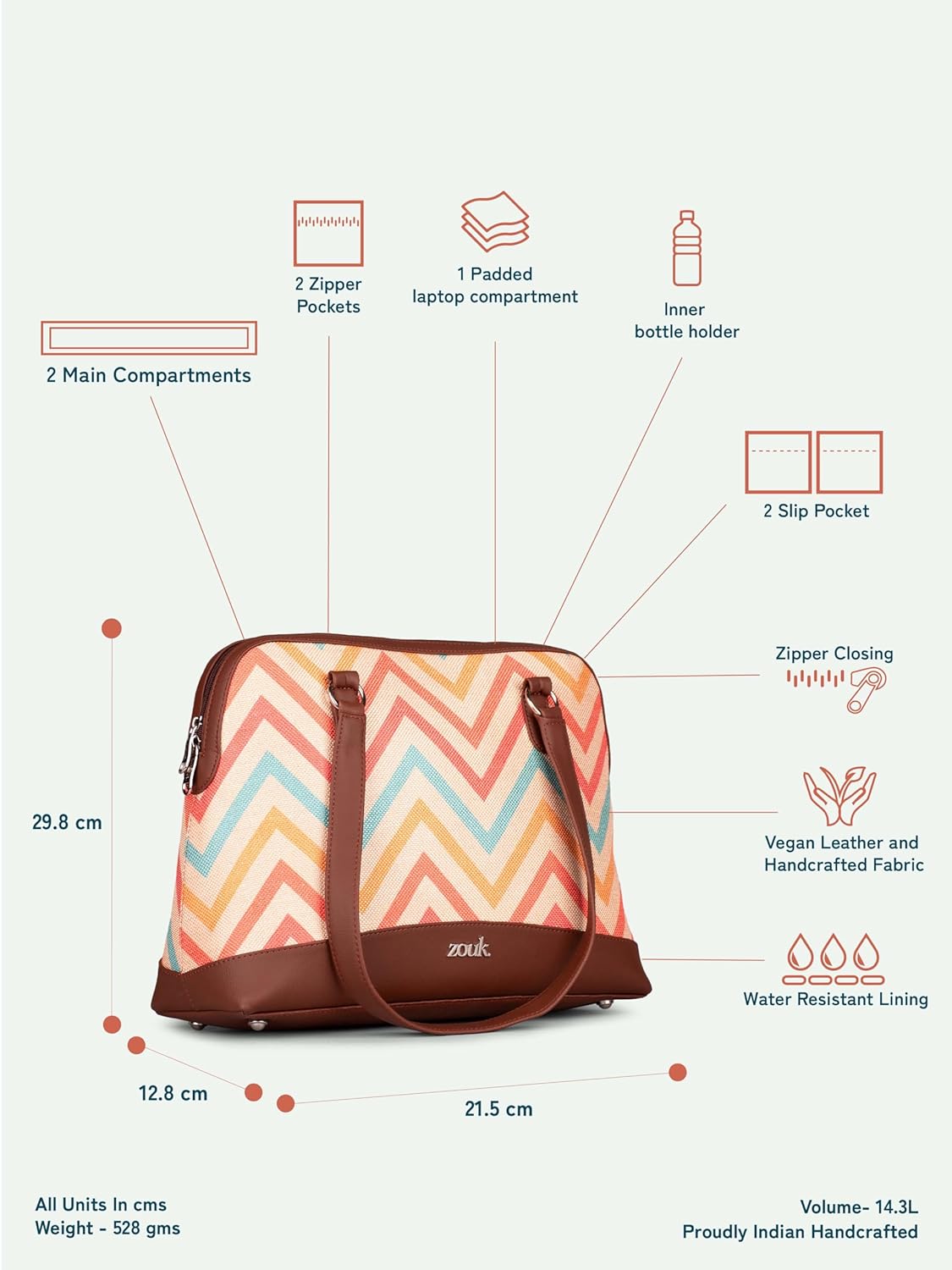 Introducing the proudly Indian and 100% PeTA-approved Conference Office Bag, seamlessly blending functionality with style. This sleek bag features vibrant prints and a distinct silhouette, with a spacious main compartment, built-in slip pockets, a padded 14-inch laptop compartment, and a quick-access back zipper pocket. Make a statement at your next meeting with a bag that reflects your professionalism.